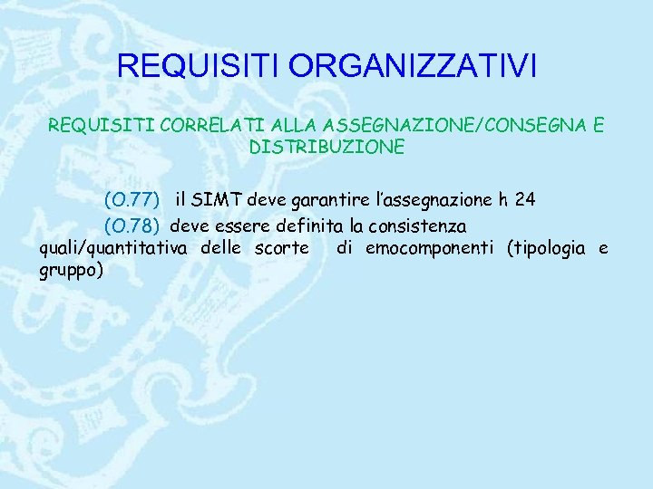 REQUISITI ORGANIZZATIVI REQUISITI CORRELATI ALLA ASSEGNAZIONE/CONSEGNA E DISTRIBUZIONE (O. 77) il SIMT deve garantire l’assegnazione h 24 (O. 78) deve essere definita la consistenza quali/quantitativa delle scorte di emocomponenti (tipologia e gruppo)