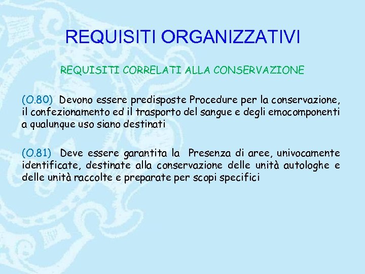 REQUISITI ORGANIZZATIVI REQUISITI CORRELATI ALLA CONSERVAZIONE (O. 80) Devono essere predisposte Procedure per la conservazione, il confezionamento ed il trasporto del sangue e degli emocomponenti a qualunque uso siano destinati (O. 81) Deve essere garantita la Presenza di aree, univocamente identificate, destinate alla conservazione delle unità autologhe e delle unità raccolte e preparate per scopi specifici
