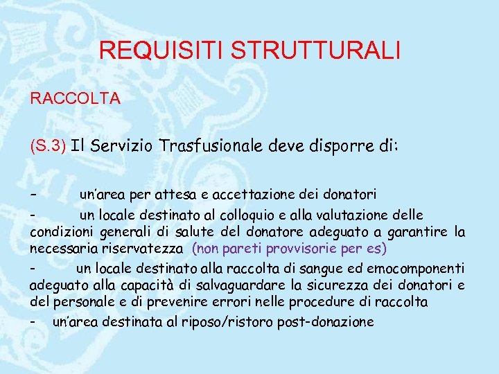 REQUISITI STRUTTURALI RACCOLTA (S. 3) Il Servizio Trasfusionale deve disporre di: - un’area per attesa e accettazione dei donatori un locale destinato al colloquio e alla valutazione delle condizioni generali di salute del donatore adeguato a garantire la necessaria riservatezza (non pareti provvisorie per es) un locale destinato alla raccolta di sangue ed emocomponenti adeguato alla capacità di salvaguardare la sicurezza dei donatori e del personale e di prevenire errori nelle procedure di raccolta - un’area destinata al riposo/ristoro post-donazione