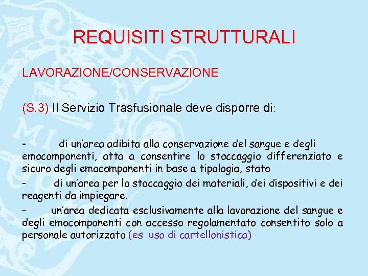 REQUISITI STRUTTURALI LAVORAZIONE/CONSERVAZIONE (S. 3) Il Servizio Trasfusionale deve disporre di: di un’area adibita alla conservazione del sangue e degli emocomponenti, atta a consentire lo stoccaggio differenziato e sicuro degli emocomponenti in base a tipologia, stato di un’area per lo stoccaggio dei materiali, dei dispositivi e dei reagenti da impiegare. un’area dedicata esclusivamente alla lavorazione del sangue e degli emocomponenti con accesso regolamentato consentito solo a personale autorizzato (es uso di cartellonistica) -
