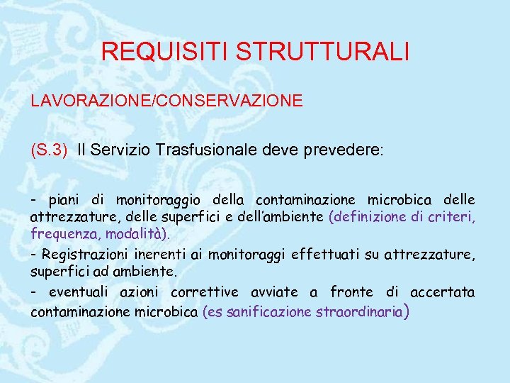 REQUISITI STRUTTURALI LAVORAZIONE/CONSERVAZIONE (S. 3) Il Servizio Trasfusionale deve prevedere: - piani di monitoraggio della contaminazione microbica delle attrezzature, delle superfici e dell’ambiente (definizione di criteri, frequenza, modalità). - Registrazioni inerenti ai monitoraggi effettuati su attrezzature, superfici ad ambiente. - eventuali azioni correttive avviate a fronte di accertata contaminazione microbica (es sanificazione straordinaria)
