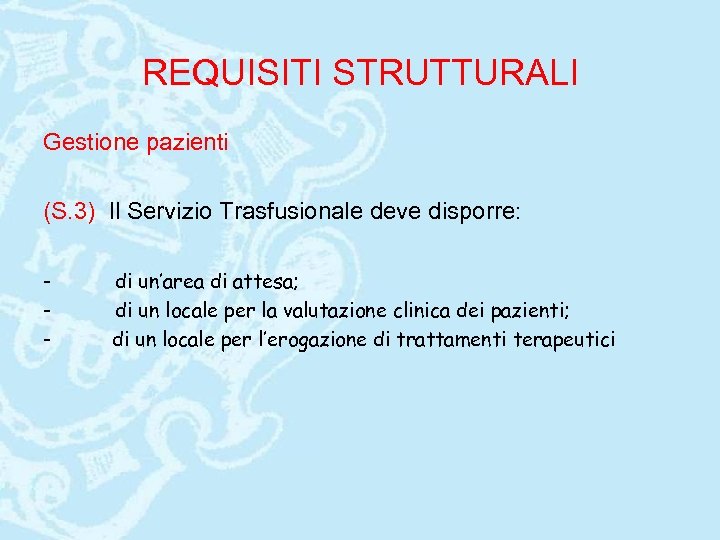 REQUISITI STRUTTURALI Gestione pazienti (S. 3) Il Servizio Trasfusionale deve disporre: - di un’area di attesa; di un locale per la valutazione clinica dei pazienti; di un locale per l’erogazione di trattamenti terapeutici