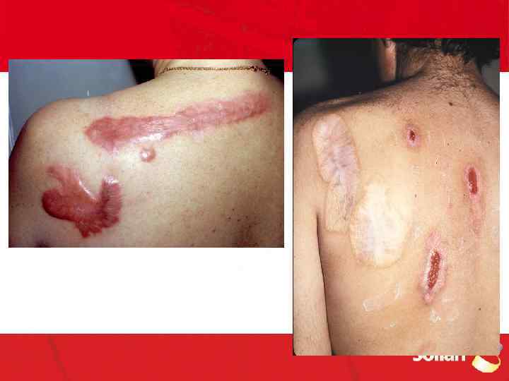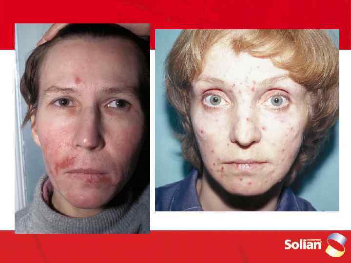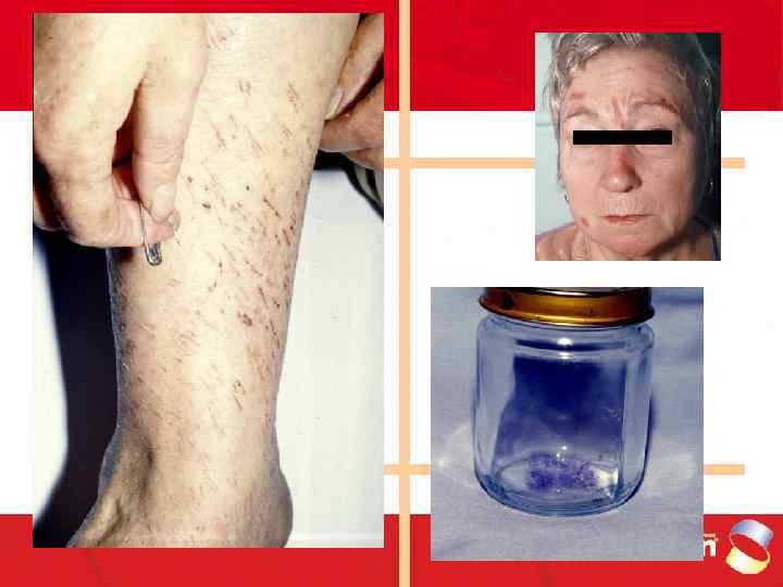Дерматологические проявления патомимии • «свежие» самоповреждения: язвы, пузыри различных размеров с серозным или серозно-геморрагическим содержимым, кровоподтеки, расчесы, ссадины, геморрагические или некротические корки • «старые» самоповреждения: рубцы, участки гипер- и депигментации • характерная локализация: преимущественно на открытых и доступных для самоповреждений участках (волосистая часть головы, лицо, верхние конечности, бедра, верхняя треть спины) • необычные форма и размеры, четкие границы очагов поражения, их линейное расположение, чередование участков здоровой и поврежденной кожи