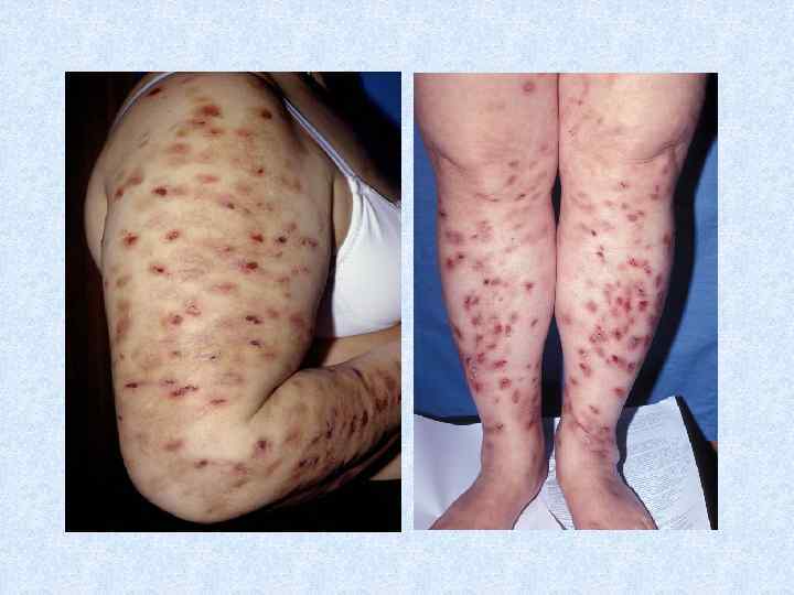 Дерматозойный бред при шизофрении Топография «заражения» не ограничена кожными покровами - распространение «паразитов» на внутренние органы (печень, кишечник, легкие, кровь) – ипохондрический бред заражения [Musalek M. , 1990] Политематичность с присоединением идей преследования Бредовое поведение с вычурными, нелепыми защитными мерами