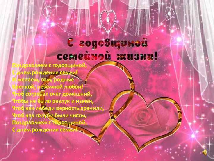И желаем, вам, родные Крепкой, неземной любви! Чтоб согревал очаг домашний, Чтобы не было разлук и измен, Чтоб как лебеди верность хранили, Чтоб как голуби были чисты, Чтоб жемчужин любви вереницу Вы в пути потерять не смогли! Поздравляем с годовщиной, С днем рождения семьи! И желаем, вам, родные Крепкой, неземной любви! Чтоб согревал очаг домашний, Чтобы не было разлук и измен, Чтоб как лебеди верность хранили, Чтоб как голуби были чисты, Поздравляем с годовщиной, С днем рождения семьи!