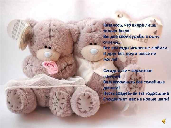 Казалось, что вчера лишь только было: Вы две свои судьбы в одну сплели. . . Все эти годы искренне любили, И друг без друга вовсе не могли! Сегодня же – серьезная причина Вам вспомнить все семейные деньки! Пусть свадебная эта годовщина Сподвигнет вас на новые шаги!