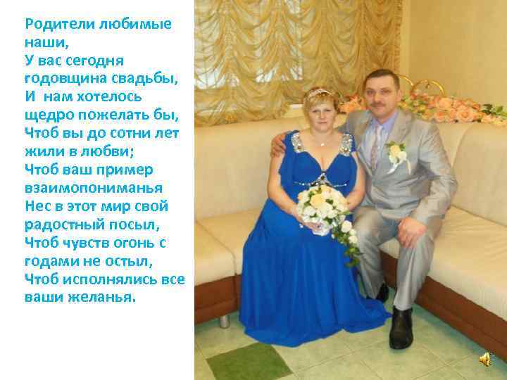 Родители любимые наши, У вас сегодня годовщина свадьбы, И нам хотелось щедро пожелать бы, Чтоб вы до сотни лет жили в любви; Чтоб ваш пример взаимопониманья Нес в этот мир свой радостный посыл, Чтоб чувств огонь с годами не остыл, Чтоб исполнялись все ваши желанья.