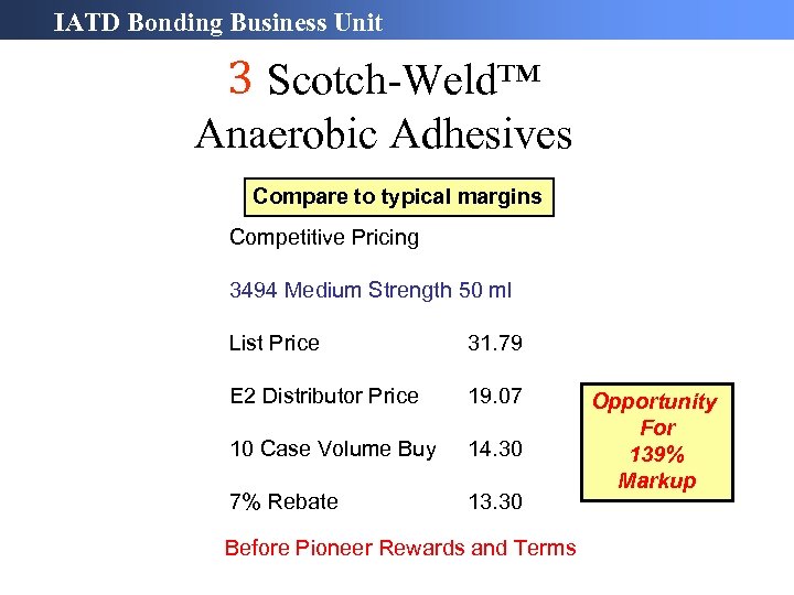 IATD Bonding Business Unit 3 Scotch-Weld™ Anaerobic Adhesives Compare to typical margins Competitive Pricing 3494 Medium Strength 50 ml List Price 31. 79 E 2 Distributor Price 19. 07 10 Case Volume Buy 14. 30 7% Rebate 13. 30 Before Pioneer Rewards and Terms Opportunity For 139% Markup