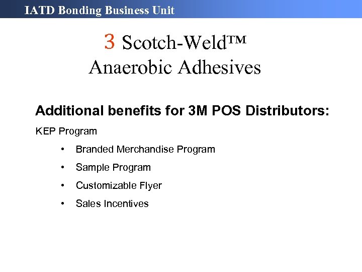 IATD Bonding Business Unit 3 Scotch-Weld™ Anaerobic Adhesives Additional benefits for 3 M POS Distributors: KEP Program • Branded Merchandise Program • Sample Program • Customizable Flyer • Sales Incentives