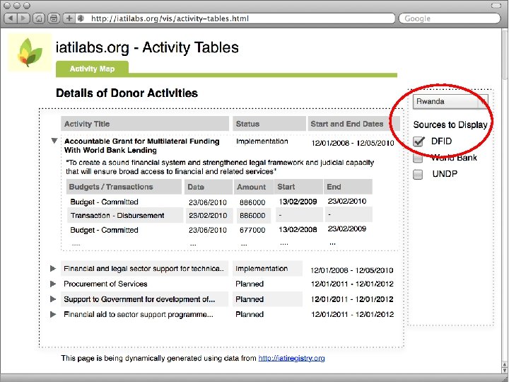 This link to the DFID data is dynamically accessing the DFID websites database, and converting it to IATI XML format. www. iaticonverter. org/DFID/rwanda This is done through no effort required from DFID (but they need a database with an API first)