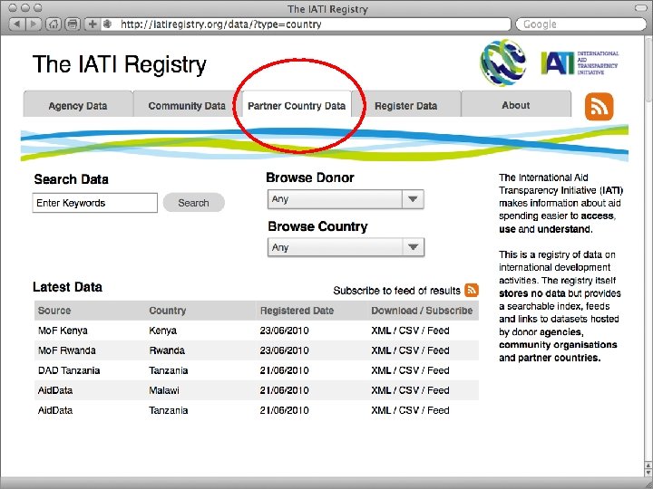 The registry can also link directly to data already being published on donor website This is the DFID projects database on their website……… They already provide this data as raw data and in an XML format. However, it is not in the IATI XML format…. .
