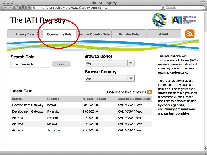 IATI Registry Conversion Users 7. Others in the community can also provide data to the community e. g. aiddata. org