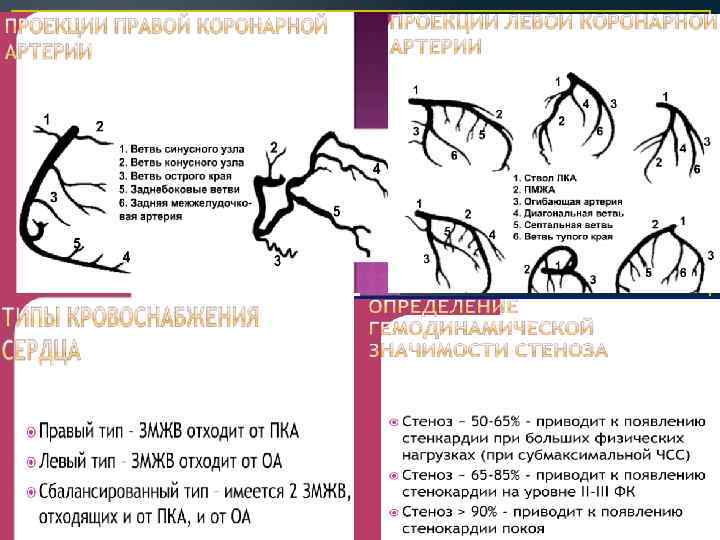 Основы анатомии коронарного русла: ПКА Отходит из правого аортального синуса. Проходит в правой части АВ борозды. Отдает синусную ветвь, ветви острого края (правожелудочковые) , ЗМЖА (правый или смешанный тип кровоснабжения сердца) и, - в 50% случаев, ЗБВ.