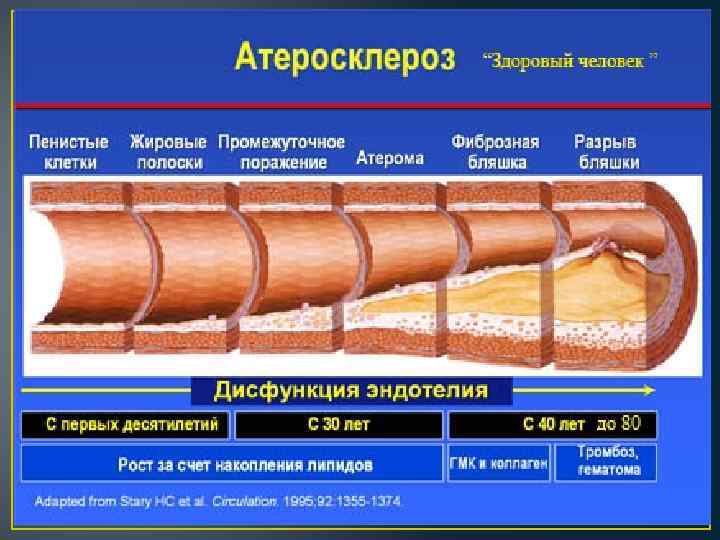 Стадии атеросклероза В результате накопления холестерина в стенке артерии формируется атеросклерот ическая бляшка. Избыток холестерина приводит к увеличению бляшки в размере, возникают препятствия току крови. Под воздействием системных неблагоприятных факторов, происходит трансформация бляшки от стабильной до нестабильной (возникают трещины и разрывы). Запускается механизм активации тромбоцитов и образования тромбов на поверхности нестабильной бляшки.