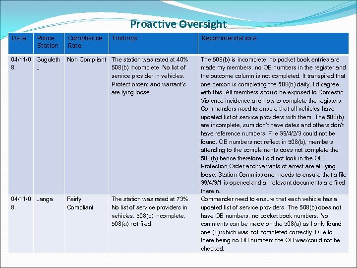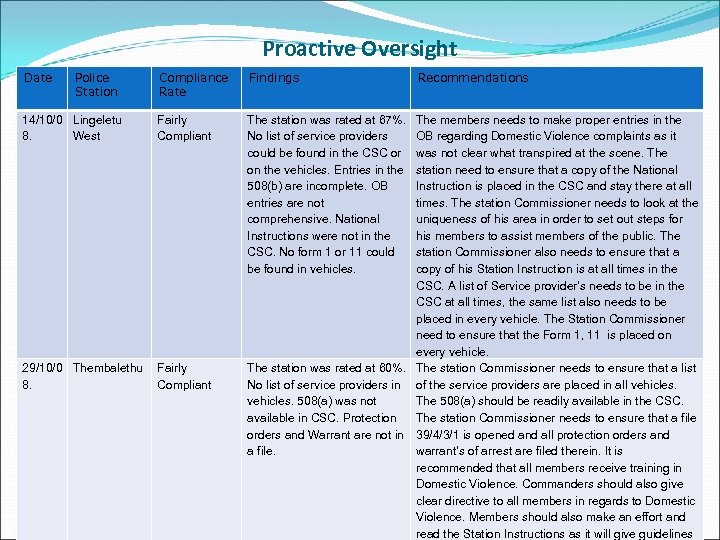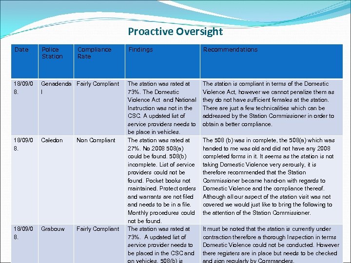 Proactive Oversight Date Police Station Compliance Rate 18/09/0 8. Genadenda Fairly Compliant l 18/09/0 8. Caledon Non Compliant 18/09/0 8. Grabouw Fairly Compliant Findings Recommendations The station was rated at 73%. The Domestic Violence Act and National Instruction was not in the CSC. A updated list of service providers needs to be place in vehicles. The station was rated at 27%. No 2008 508(a) could be found. 508(b) incomplete. List of service providers could not be found. Pocket books not maintained. Protect orders and warrants are not filed and needs to be in a file. Monthly procedures could not be found. The station was rated at 73%. A updated list of service provider needs to be placed in the CSC and The station is compliant in terms of the Domestic Violence Act, however we cannot penalize them as they do not have sufficient females at the station. There are just a few technicalities which can be addressed by the Station Commissioner in order to obtain a better compliance. The 508 (b) was in complete, the 508(a) which was handed to me was old and did not have any 2008 completed forms in it. It seems as the station is not taking Domestic Violence very serously, it is therefore recommended that the Station Commissioner became hand-on with regards to Domestic Violence and the compliance thereof. Although all our aspect of the station visit was not covered we would just like to bring the following to the attention of the Station Commissioner. It must be noted that the station is currently under contraction therefore a thorough Inspection in terms Domestic Violence could not be conducted. However there registers are in place but needs to be checked