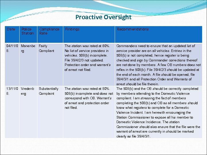 Proactive Oversight Date Police Station Compliance Rate Findings Recommendations 30/10/0 Pacaltsdorp Substantially 8. Complaint The station was rated at 80%. No list of service providers in vehicles. 31/10/0 Conville 8. The station was rated at 67%. No list of service providers in vehicles. File with protect orders and warrant is old. The station Commissioner needs to ensure that all vehicles have a list of service providers. Furthermore I think that the station is doing very well in terms with compliance with the Domestic Violence Act and the National Instruction. I would also like to thank Cap. Swart for assisting us after 17: 00 on the 30/10/08. The station Commissioner needs to ensure that all vehicles have a copy of the list of service providers. The files in the CSC for the protection orders are very old and needs to be updated. All protection orders and warrants of arrest need to be filed. Fairly Compliant