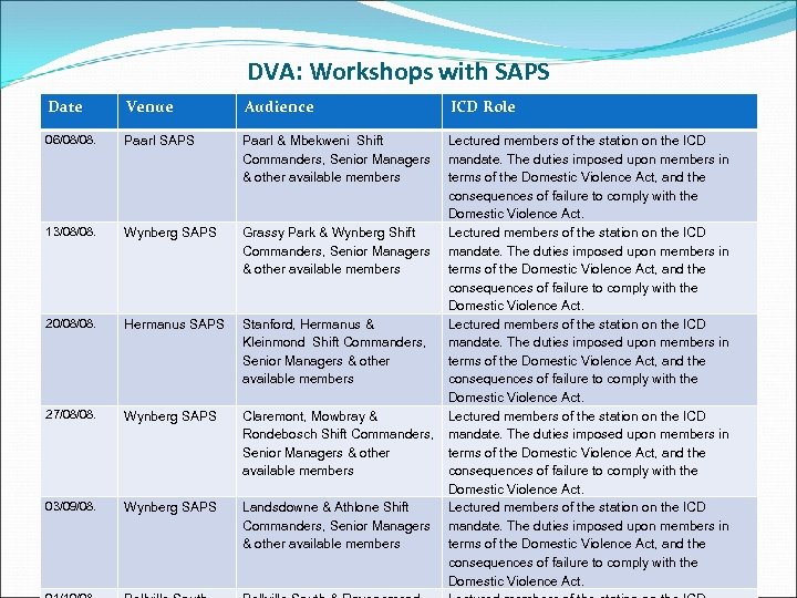 DVA: Workshops with SAPS Date Venue Audience ICD Role 06/08/08. Paarl SAPS Paarl & Mbekweni Shift Commanders, Senior Managers & other available members 13/08/08. Wynberg SAPS Grassy Park & Wynberg Shift Commanders, Senior Managers & other available members 20/08/08. Hermanus SAPS Stanford, Hermanus & Kleinmond Shift Commanders, Senior Managers & other available members 27/08/08. Wynberg SAPS Claremont, Mowbray & Rondebosch Shift Commanders, Senior Managers & other available members 03/09/08. Wynberg SAPS Landsdowne & Athlone Shift Commanders, Senior Managers & other available members Lectured members of the station on the ICD mandate. The duties imposed upon members in terms of the Domestic Violence Act, and the consequences of failure to comply with the Domestic Violence Act.