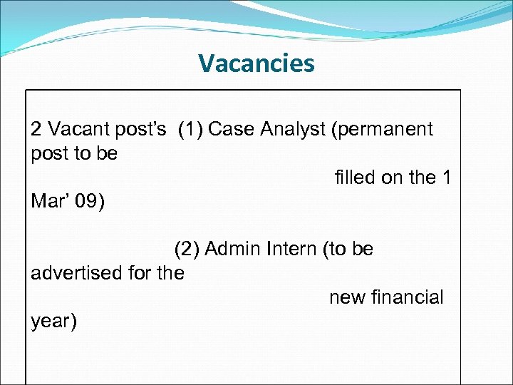 Vacancies 2 Vacant post’s (1) Case Analyst (permanent post to be filled on the 1 Mar’ 09) (2) Admin Intern (to be advertised for the new financial year)