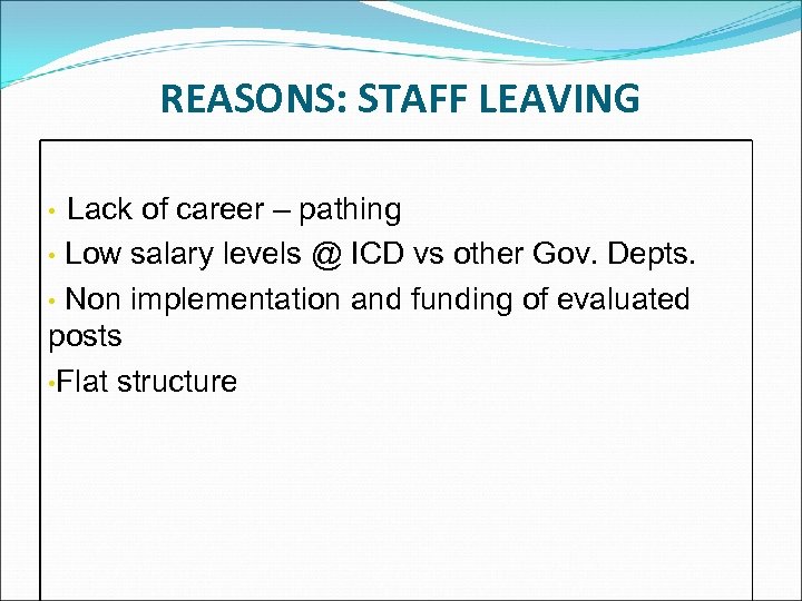 REASONS: STAFF LEAVING Lack of career – pathing • Low salary levels @ ICD vs other Gov. Depts. • Non implementation and funding of evaluated posts • Flat structure •