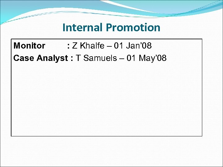 Internal Promotion Monitor : Z Khalfe – 01 Jan’ 08 Case Analyst : T Samuels – 01 May’ 08