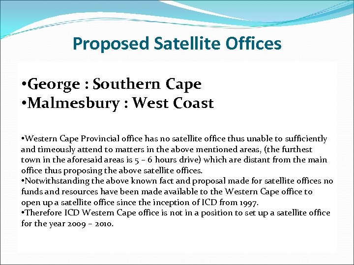Proposed Satellite Offices • George : Southern Cape • Malmesbury : West Coast • Western Cape Provincial office has no satellite office thus unable to sufficiently and timeously attend to matters in the above mentioned areas, (the furthest town in the aforesaid areas is 5 – 6 hours drive) which are distant from the main office thus proposing the above satellite offices. • Notwithstanding the above known fact and proposal made for satellite offices no funds and resources have been made available to the Western Cape office to open up a satellite office since the inception of ICD from 1997. • Therefore ICD Western Cape office is not in a position to set up a satellite office for the year 2009 – 2010. Wes