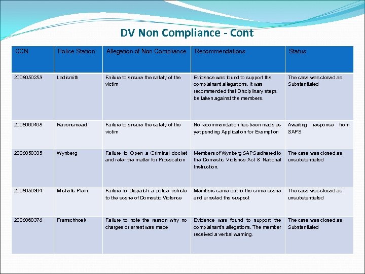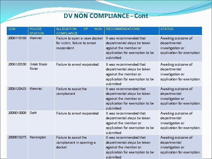 DV NON COMPLIANCE - Cont CCN POLICE STATION ALLEGATION OF NON COMPLIANCE RECOMMENDATIONS STATUS 2009010358 Ravensmead Failure to arrest responded Awaiting outcome of departmental investigation or application for exemption. 2009010520 Pacaltsdorp Failure to arrest responded It was recommended that departmental steps be taken against the member or application for exemption to be submitted Awaiting outcome of departmental investigation or application for exemption.
