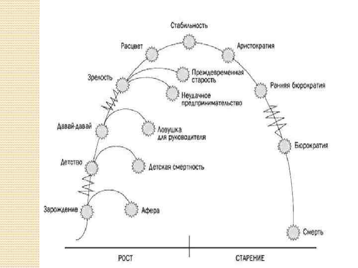 Таким образом, жизненный цикл организации — это последовательность следующих этапов: Название этапа Доминирующие роли «Ухаживание» (Courtship) — зарождение бизнеса (p) (a) (E) (i) Младенчество (Infancy) (P) (a) (e) (i) (Go-go) — активная деятельность (P) (a) (E) (i) Юность (Adolescence) (p) (A) (E) (i) Расцвет (Prime) (P) (A) (E) (i) Стабильность (Stable) Аристократизм (Aristocracy) (P) (A) (e) (I) «Взаимное обвинение» (Recrimination) — старение (p) (A) (…) (i) Бюрократизм (Bureaucracy) (…) (A) (…) Смерть (Death) (…) (…)