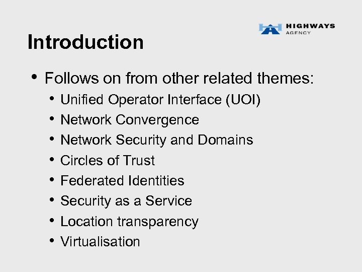 Introduction • Follows on from other related themes: • • Unified Operator Interface (UOI) Network Convergence Network Security and Domains Circles of Trust Federated Identities Security as a Service Location transparency Virtualisation