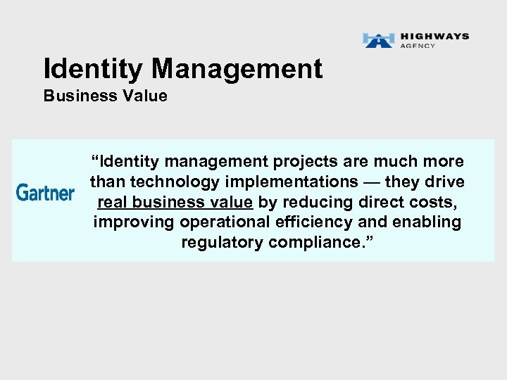 Identity Management Business Value “Identity management projects are much more than technology implementations — they drive real business value by reducing direct costs, improving operational efficiency and enabling regulatory compliance. ”