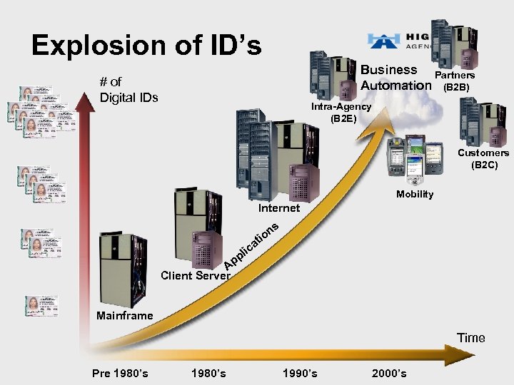 Explosion of ID’s Business Partners Automation (B 2 B) # of Digital IDs Intra-Agency (B 2 E) Customers (B 2 C) Mobility Internet ns o i at c i pl p A Client Server Mainframe Time Pre 1980’s 1990’s 2000’s
