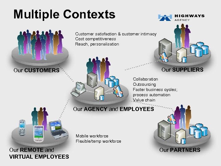 Multiple Contexts Customer satisfaction & customer intimacy Cost competitiveness Reach, personalisation Our SUPPLIERS Our CUSTOMERS Collaboration Outsourcing Faster business cycles; process automation Value chain Our AGENCY and EMPLOYEES Mobile workforce Flexible/temp workforce Our REMOTE and VIRTUAL EMPLOYEES Our PARTNERS