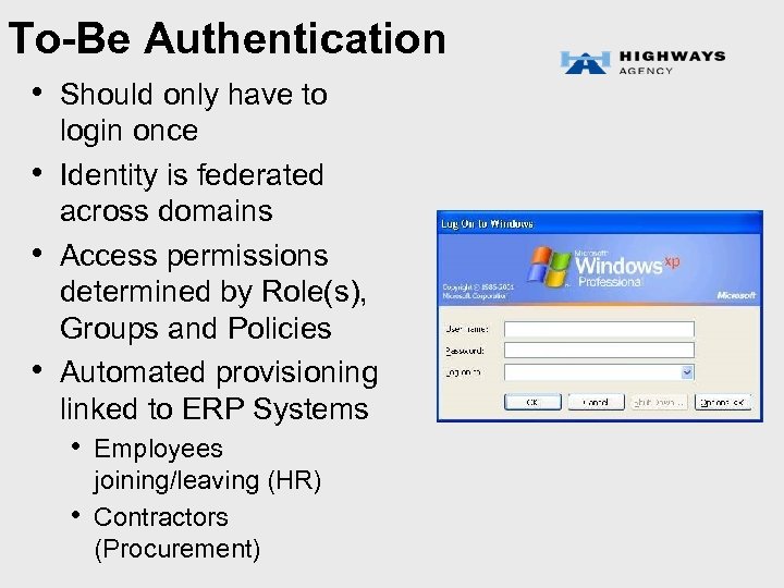 To-Be Authentication • Should only have to • • • login once Identity is federated across domains Access permissions determined by Role(s), Groups and Policies Automated provisioning linked to ERP Systems • Employees • joining/leaving (HR) Contractors (Procurement)
