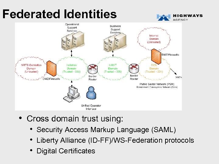 Federated Identities • Cross domain trust using: • Security Access Markup Language (SAML) • Liberty Alliance (ID-FF)/WS-Federation protocols • Digital Certificates