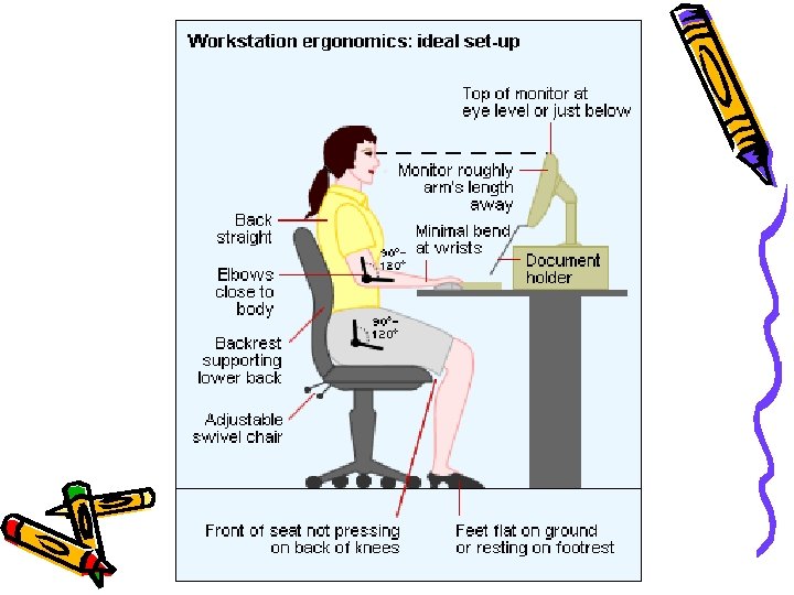 Computer Care • Ergonomics: This refers to any Health and Safety issues relating to PC Use. For Example: In your work area: To Reduce Screen Glare, place a screen over your monitor. To reduce sound pollution in your office, place sound absorbing materials on furniture, walls, ceilings and floors. • To prevent discomfort and permanent injury, create an ergonomically designed workstation/Desk Area, for Example: (a) Your arm angle in keyboarding should be 15 -30 Degrees below your line of sight (b) The Screen should be 3 -4 times brighter than the room, to avoid eye strain. (c) Your forearms should be horizontal, your lower back should have support, you should have an adjustable chair, and your feet should be flat on the floor. (d) You should have a wrist rest to prevent Repetitive Strain Injury. 4 MAIN AREAS: - 1. HARDWARE 2. SOFTWARE 3. NETWORKS 4. COMPUTER CARE