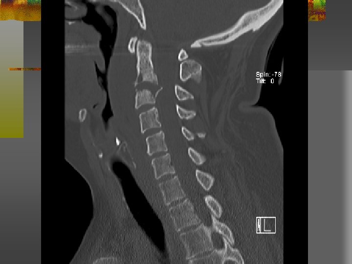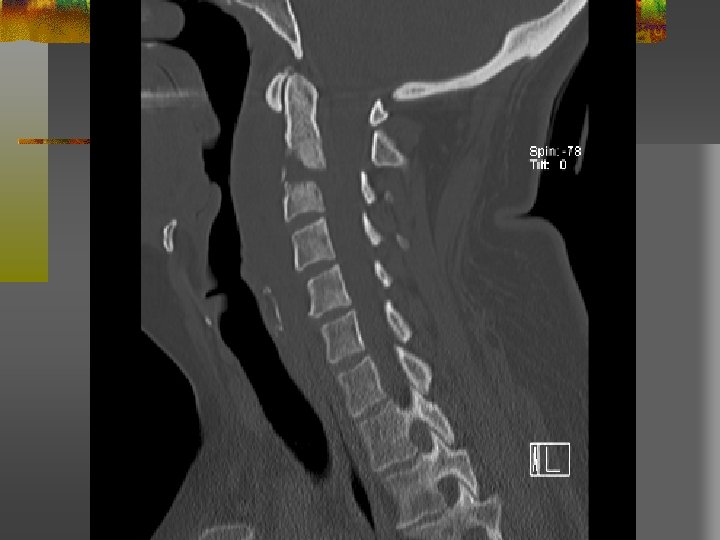 Physical Exam Afebrile – P 74, R 18, BP 134/75, 97% on RA INAD, wearing c-collar EOMI, PERRLA, nonicteric No e/e on OP No JVD No LAD appreciated in cervical, supraclavicular, axillary, or inguinal regions RRR no murmurs CTAB No rashes or skin lesions, no nail lesions A&Ox 3, pleasant and cooperative, talkative. Soft NT NABS No c/c/e, pulses 2+ and equal in BU and LE Normal tone, full ROM present. No tenderness to palpation of thoracic or lumbar spine. No apparent tenderness to palpation when I watched neurosurgery palpate the patient’s cervical spine. CN II-XII intact, strength 5/5 in BU and LE, reflexes 2+ in BU and LE, cerebellar exam intact