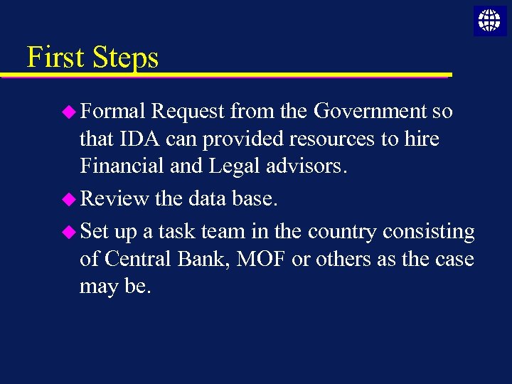 First Steps u Formal Request from the Government so that IDA can provided resources to hire Financial and Legal advisors. u Review the data base. u Set up a task team in the country consisting of Central Bank, MOF or others as the case may be.