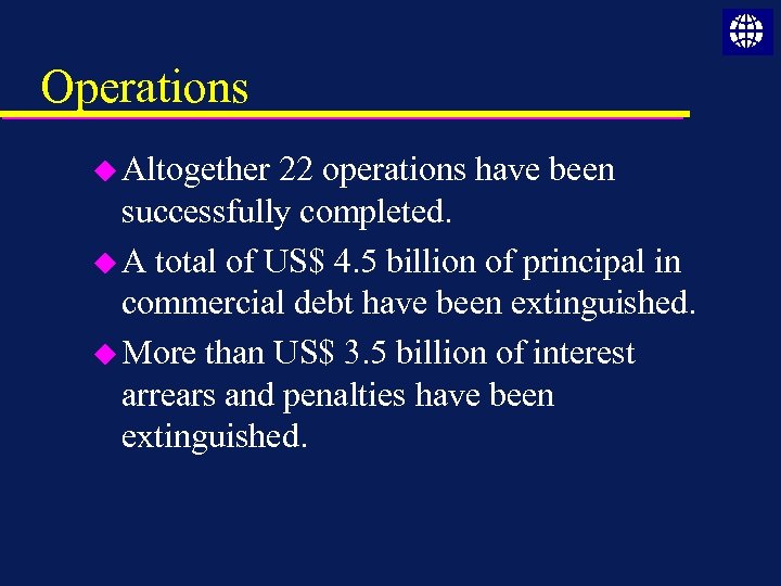 Operations u Altogether 22 operations have been successfully completed. u A total of US$ 4. 5 billion of principal in commercial debt have been extinguished. u More than US$ 3. 5 billion of interest arrears and penalties have been extinguished.