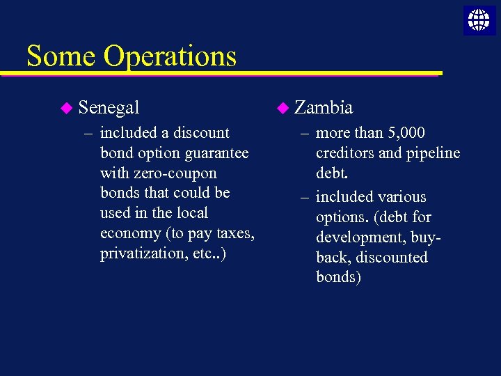 Some Operations u Senegal – included a discount bond option guarantee with zero-coupon bonds that could be used in the local economy (to pay taxes, privatization, etc. . ) u Zambia – more than 5, 000 creditors and pipeline debt. – included various options. (debt for development, buyback, discounted bonds)