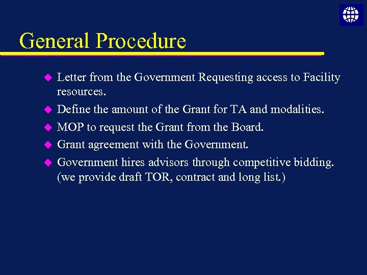 General Procedure u u u Letter from the Government Requesting access to Facility resources. Define the amount of the Grant for TA and modalities. MOP to request the Grant from the Board. Grant agreement with the Government hires advisors through competitive bidding. (we provide draft TOR, contract and long list. )