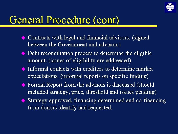 General Procedure (cont) u u u Contracts with legal and financial advisors. (signed between the Government and advisors) Debt reconciliation process to determine the eligible amount. (issues of eligibility are addressed) Informal contacts with creditors to determine market expectations. (informal reports on specific finding) Formal Report from the advisors is discussed (should included strategy, price, threshold and issues pending) Strategy approved, financing determined and co-financing from donors identify and requested.