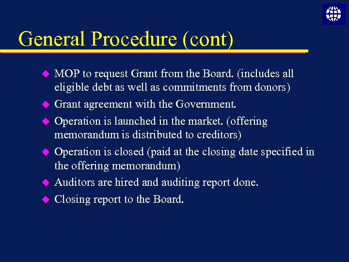 General Procedure (cont) u u u MOP to request Grant from the Board. (includes all eligible debt as well as commitments from donors) Grant agreement with the Government. Operation is launched in the market. (offering memorandum is distributed to creditors) Operation is closed (paid at the closing date specified in the offering memorandum) Auditors are hired and auditing report done. Closing report to the Board.