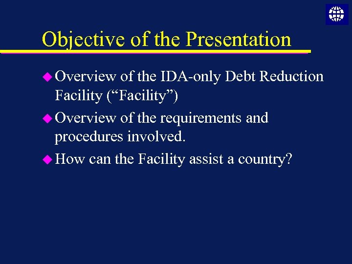 Objective of the Presentation u Overview of the IDA-only Debt Reduction Facility (“Facility”) u Overview of the requirements and procedures involved. u How can the Facility assist a country?