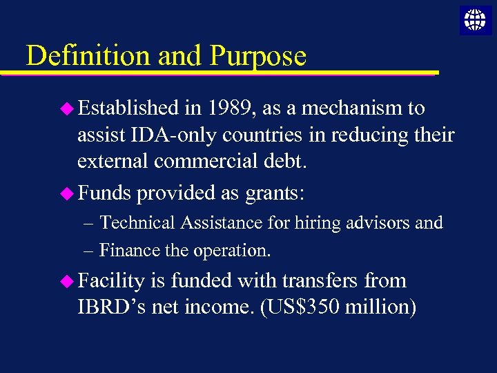 Definition and Purpose u Established in 1989, as a mechanism to assist IDA-only countries in reducing their external commercial debt. u Funds provided as grants: – Technical Assistance for hiring advisors and – Finance the operation. u Facility is funded with transfers from IBRD’s net income. (US$350 million)