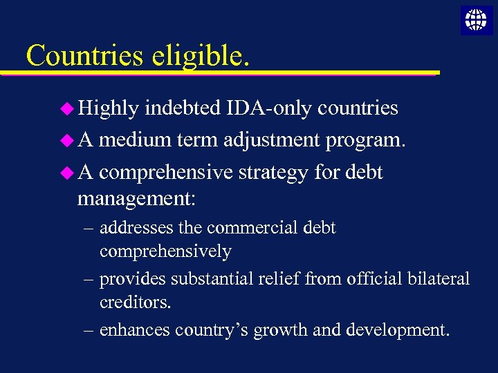 Countries eligible. u Highly indebted IDA-only countries u A medium term adjustment program. u A comprehensive strategy for debt management: – addresses the commercial debt comprehensively – provides substantial relief from official bilateral creditors. – enhances country’s growth and development.