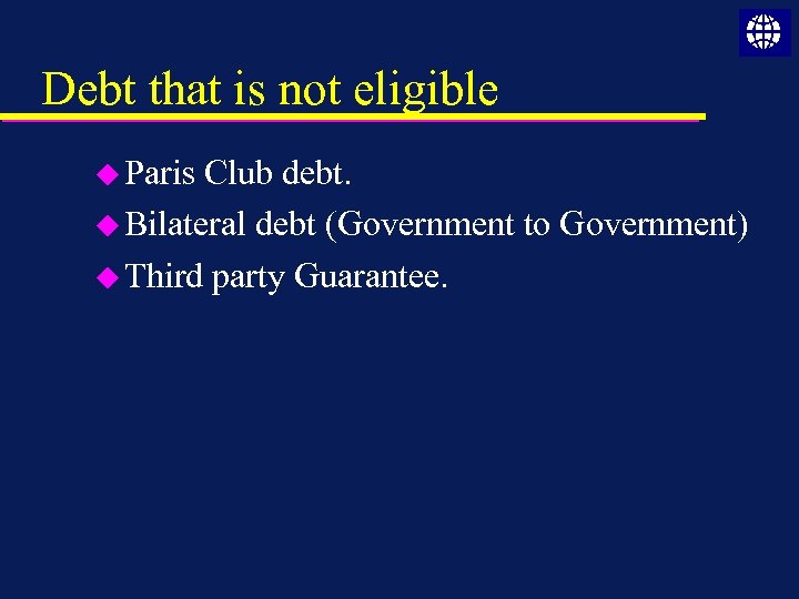 Debt that is not eligible u Paris Club debt. u Bilateral debt (Government to Government) u Third party Guarantee.