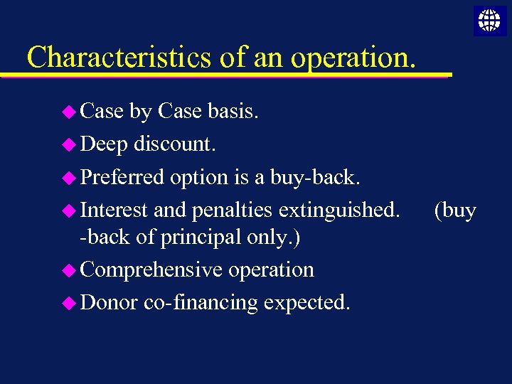 Characteristics of an operation. u Case by Case basis. u Deep discount. u Preferred option is a buy-back. u Interest and penalties extinguished. -back of principal only. ) u Comprehensive operation u Donor co-financing expected. (buy
