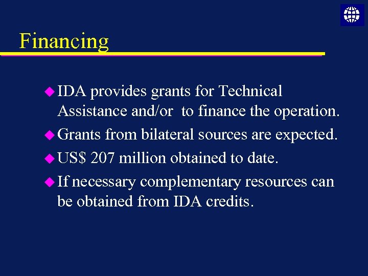 Financing u IDA provides grants for Technical Assistance and/or to finance the operation. u Grants from bilateral sources are expected. u US$ 207 million obtained to date. u If necessary complementary resources can be obtained from IDA credits.