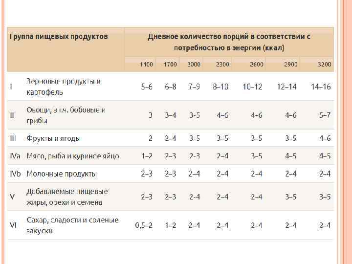 Из пищевой группы мясо–рыба–курица–яйцо следует предпочитать рыбу, нежирное мясо и нежирные мясные продукты. Колбасу, сосиски и ветчину употреблять в умеренном количестве. Как молочных, так и мясных продуктов следует потребить 2 -3 порций в день.