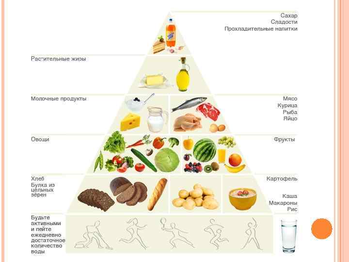 ПИЩЕВАЯ ПИРАМИДА Пищевая пирамида показывает, что и в каком количестве надо есть, чтобы наше питание была здоровым и сбалансированным Углеводы (цельнозерновые продукты, хлеб из муки грубого помола, зерновые каши, макаронные изделия) расположены в первый этаж пирамиды и составляют не менее 50% ежедневного рациона. Овощи и фрукты — следующая ступень пищевой пирамиды, 25% от общего объема пищи. Белковые продукты (мясо, рыба, птица, бобовые, орехи, яйца) — 15 -20% от рациона. Жиры и сахара — вершина пирамиды и не более 5% от общего рациона.