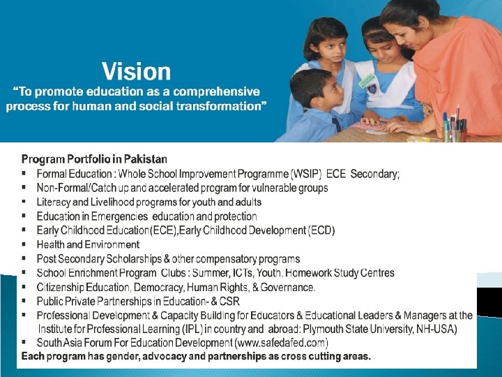 Summary of Proposed Programs 2010 -2015 Scaled up District Wide – Alliance Based Initiatives Program Title No. of Outreach Districts Children Covered (+) ASER 2010 2015 30 -138 1 million +children US $ 5 million Year 1 = 150, 000 Chalo Parho Barho (CPB) 2011 -2015 4 – scaling up to all 1 million children each year US $ 7. 5 million Year 1 = 1. 6 million School Based Budget Tracking 4 districts 12 districts Total 700 schools 4 million Budgets 2010 – 2015 US $ 5 million Year 1 = 1 million US $ 17. 5 million Annually = US $ 3. 8 million 10